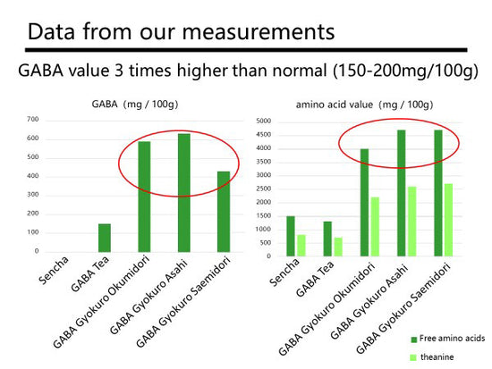 Conventional GABA teas have a GABA value of 150 to 200 mg. As a result of using gyokuro tea leaves, which initially contain a high amount of glutamic acid, the substrate of GABA, we were able to increase these values to reach 300 to 600 mg.